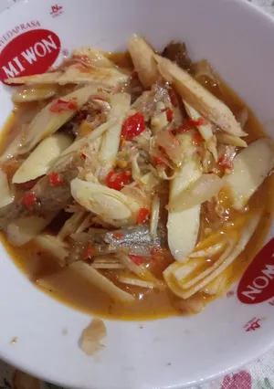 4. Selanjutnya masukan umbutnya tambahkan air 35 ml dan penyedapnya tutup sebentar masak hingga umbutnya agak lembut dan bumbu meresap angkat dan sajikan.